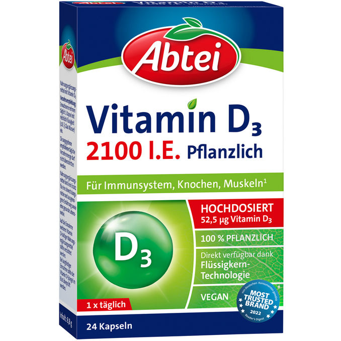 Das hochdosierte Vitamin D3 deckt deinen Bedarf wenn die körpereigene Produktion nicht ausreicht. Die Kapseln unterstützen das Immunsystem, Knochen und tragen zum Erhalt der normalen Muskelfunktion bei.