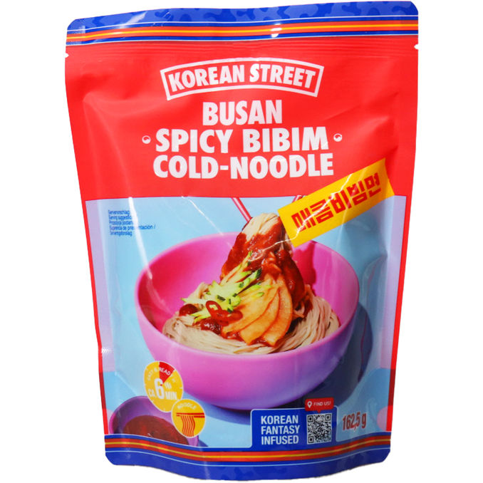 Ein scharfes Nudelgericht im Stil koreanischen Street Foods. 🌶️🍜🇰🇷 Erleben Sie den Geschmack Koreas mit unseren Busan Spicy Bibim Cold-Noodles. Diese traditionelle Delikatesse kombiniert eine erfrischende Schärfe mit süß-sauren Noten und knackigem Gemüse. Sie sind schnell zubereitet, perfekt für heiße Tage und eine authentische Bereicherung für jede Küche.