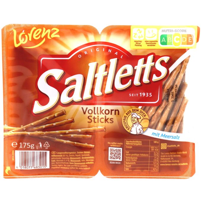 Die Saltletts Vollkorn Sticks bestehen zu über 80 % aus Weizen-Vollkornmehl und werden mit einer Prise Meersalz verfeinert. Der knusprige Snack eignet sich ideal für ernährungsbewusste Knabberfans, die Wert auf Vollkornprodukte legen. Ohne zugesetzte Geschmacksverstärker.