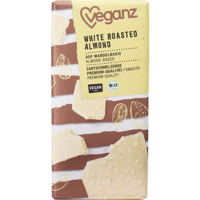Die vegane und besonders zarte weiße Schokolade mit gerösteten Mandeln schmeckt einfach himmlisch.